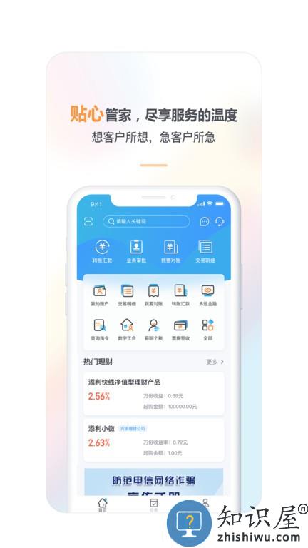一站式全能管家服务,为机关社团企事业单位客户提供了开放式、一体化、综合性的线上金融服务平台,集转账汇款、账户查询、银企对账、财富管理、融资贷款和工资代发于一体,致力于为企业提供安全、便捷、高效的普惠金融服务。让用户可以更加高效的办公,让企业可以更加方便的管理。