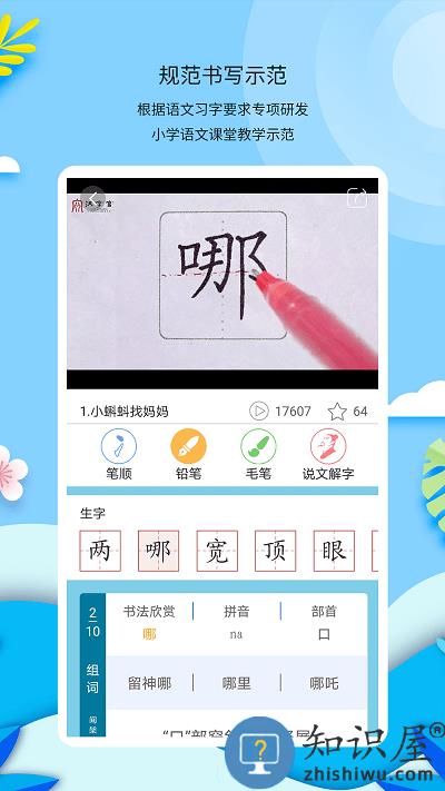 4、规范字教学:与语文教材同步,每一个字都有三笔字讲解示范,20000个教学微视频;130000多张古今书法家书法高清欣赏。