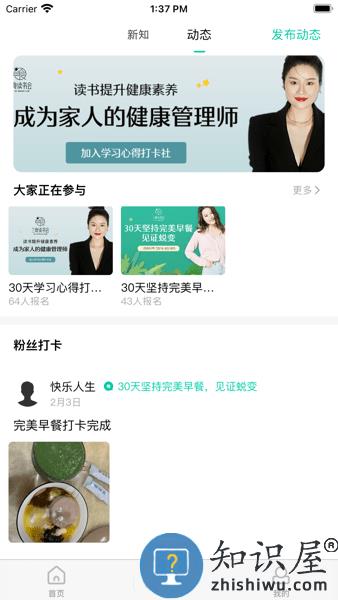 【社区】:读书会吸纳了一群爱好健康并愿意切身实践的养生达人,通过不同主题的打卡式互动和达人亲身带领,引导新手在社区中学习、践行、提升全家的幸福指数。