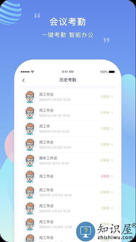 教师通过app实现会议考勤功能,智能办公,便于定期汇总分析。