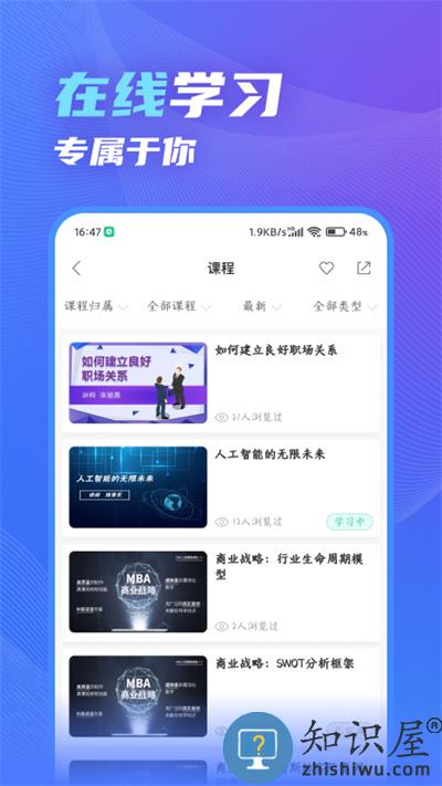 为企业员工用户提供了海量职业培训学习资源,可以随时在线获取需要的培训课程内容,过贴心的运营和咨询服务,帮助组织和企业建立专属的网络学院,现组织和企业学习的规模化、敏捷化和个性化,在这里可以随时随地,放心学习,助力员工与企业共同成长进步。