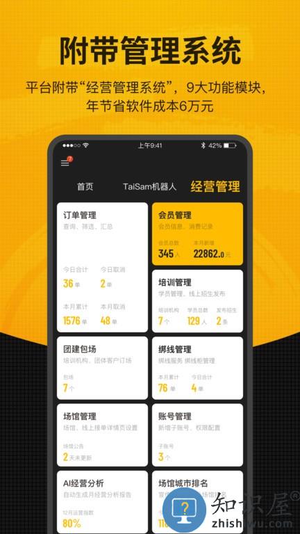 经营管理系统:平台附带“经营管理系统”,9大模块,面面俱到,为场馆年节省软件成本6万元
