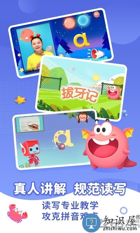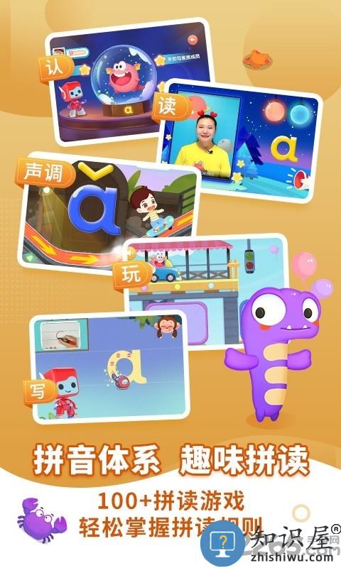●五大环节学拼音,课程体系更科学——认拼音:拼音字母讲解 字母字形轻松掌握;读拼音:真人口型示范,字母跟读发声准确,AI童声识别,精准判断孩子发音;写拼音:真人握笔书写,字母书写笔画标准;学声调:创意动画演示,声调学习科学有趣;玩拼音:拼音游戏练习,强化训练加深记忆;