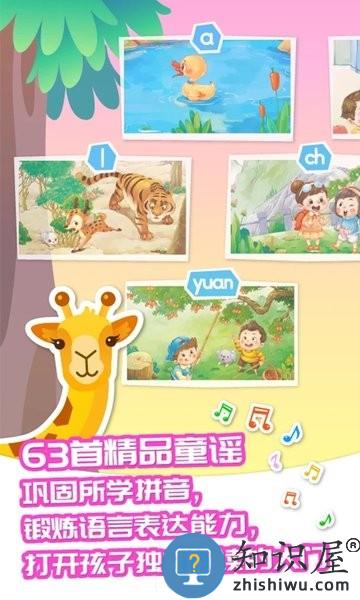 5、精品童谣,朗朗上口,每个拼音字母有配有一首相关的童谣,每首童谣前都有一幅与童谣相关的趣味拼图,每一句中含有此拼音字母的汉字都做强调处理,巩固所学拼音,打开孩子独立阅读的大门。