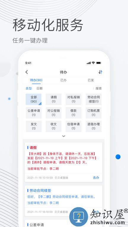2.便捷移动化服务:设立待办、已办以及已发版区,各项事务按照分类明确清楚,管理层人员可以清晰查看信息,方便企业管理。