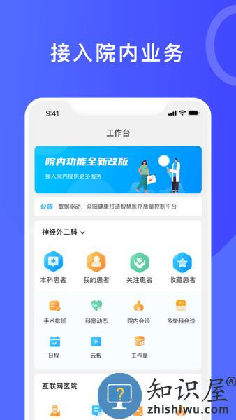 众阳医信医生手机端专为我们的医生打造,目的就是方便他们在院内更好的进行办公,内置有一站式的医生工作台,您可以通过它来快速查看手术排班、查看最新的患者情况!