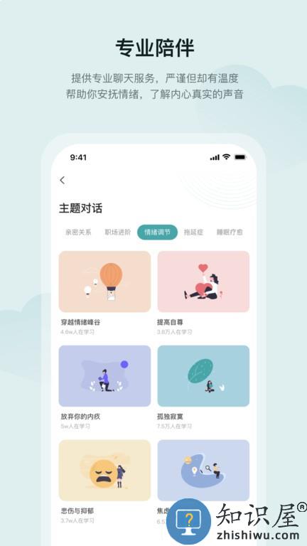 【场景化陪聊】:以认知行为疗法(CBT)为基础,围绕校园、职场、家庭、个人成长4大场景,300多个日常问题,开展场景化聊天对话来实现情绪疏导,提供问题解决方案。