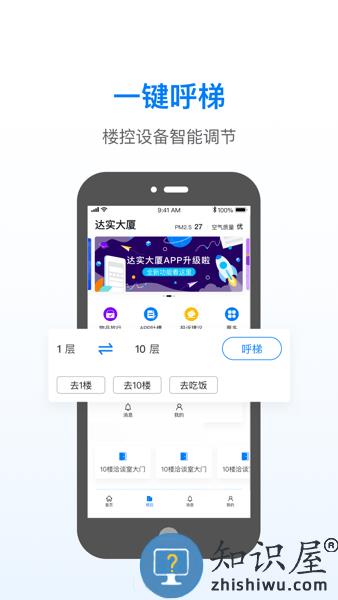 达实大厦app内置有一卡通、餐厅、展厅预约、投诉建议、访客邀约、会议室等工具,可以方便您通过手机一键开门,设置呼梯,预约倒放楼层!