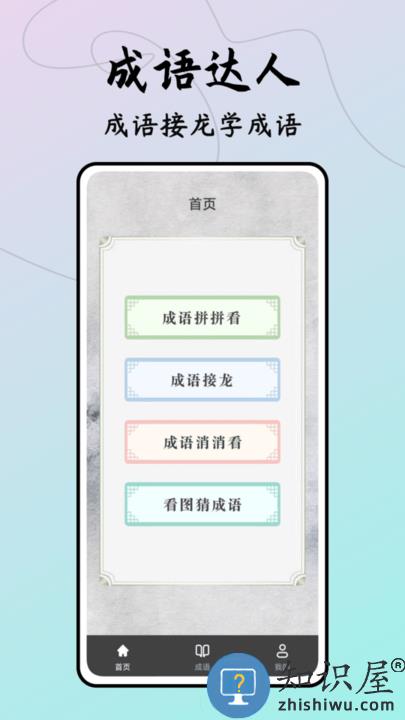 2.应用包含4大部分内容,分别是成语拼拼看、成语接龙、成语消消看、看图猜成语