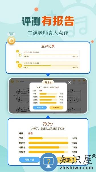 没问题!我们支持全曲评测和分段评测,评测结束会自动给出多维度的打分报告,每次的进步都可以在报告里一目了然,并且能根据各个维度的弱项各个击破,针对性提高。