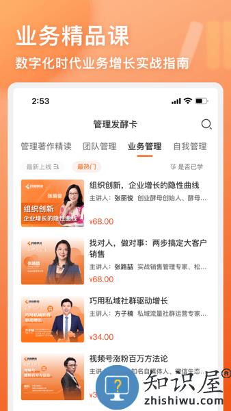 酵母工坊由北京创业酵母管理咨询有限公司研发,是致力于帮助职场人提升管理能力、业务能力,增强职场竞争力的一款学习型APP应用。 酵母工坊的管理发酵卡每周上新,由来自各企业的管理、业务实战专家,针对职场团队管理、业务增长瓶颈、职场缺乏方向三大难题,提供了四大模块的视频课程,包括管理著作精读、团队管理、业务管理、个人职业素养,并提供专属助学服务。