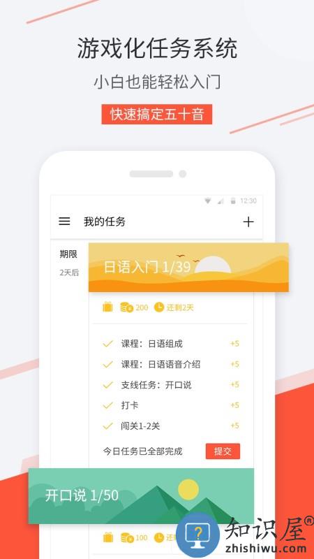 专为零基础学员打造的的日语学习任务系统,是你随身的日语老师,知识讲解、单词背诵、练习测试、总结复习,带着你一步一个脚印的学好日语。