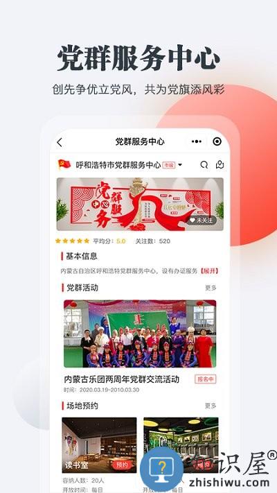 3、丰富的党群服务中心服务项目,上面给用户设置了办证服务、活动报名服务以及场地预约等服务;