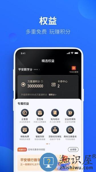 转账免费、贷款优先审批、0元享企查查专业版、知鸟培训等,还可签到领积分、兑奖品。