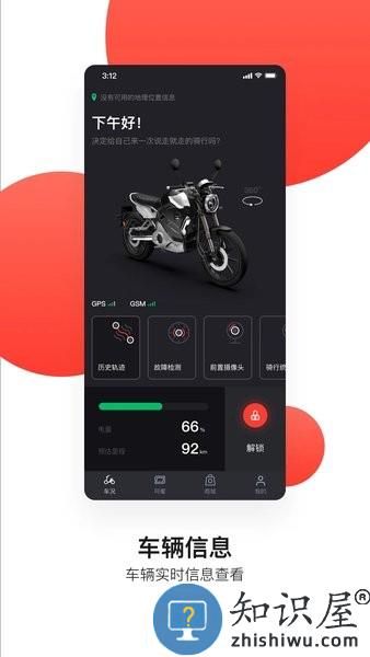 车况:一键车检、车辆定位、剩余电量、行驶里程、骑行轨迹、数据统计;