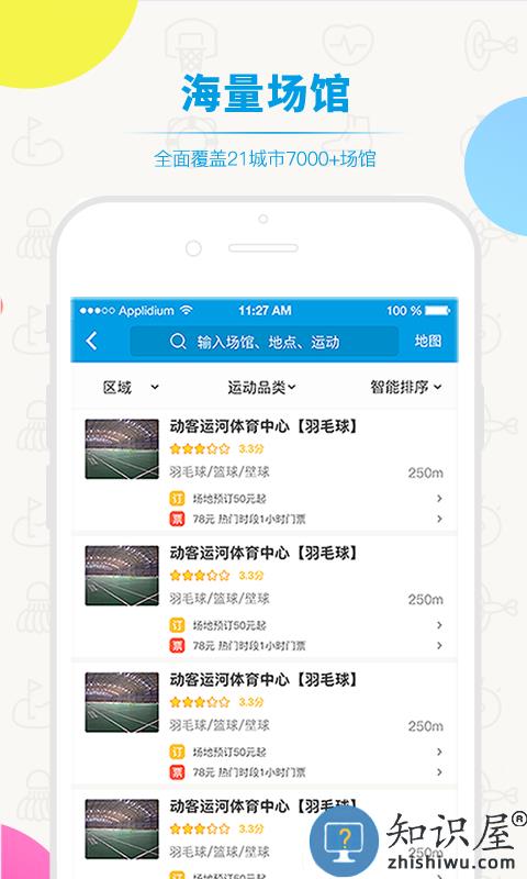 2、全品类体育运动场地预订及关联服务平台,多达几十项运动,18个城市5000家体育运动场馆在线实时查询、订场和场馆门票预订。运动爱好者可不受时间、地点、订场和球友限制,随时随地轻松运动。