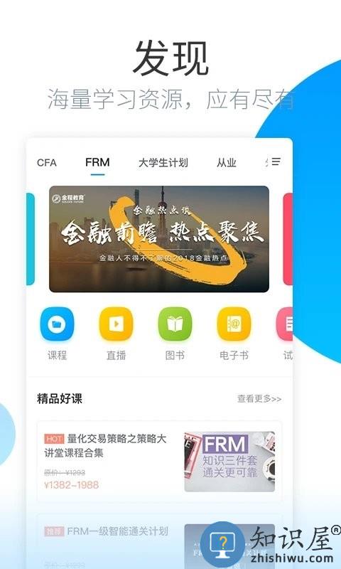 金程网校旗舰版客户端是金程网校为广大财经学子特别打造的手机客户端。 APP包含课程学习,习题练习、直播课堂、学习互动等模块。名师授课 , 随时可学。涵盖CFA、FRM、CFRM、CMA、ACCA、CPA、RFP、会计从业、证券从业、期货从业、银行从业等20余门,逾200个细分课程。