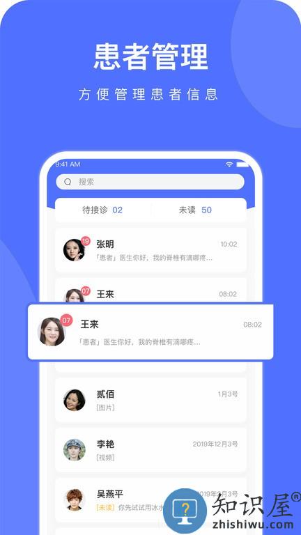 【我的患者】:方便医生查看患者就诊信息,线上分组管理患者,支持群发消息