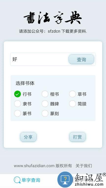 1、可查询行、草、隶、篆、楷五种书法字体;