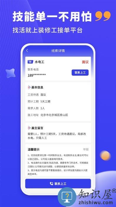 水电工接单是一个平台找装修师傅的招工找活软件,同城装修水电工接单app,涵盖装修泥瓦工、装修水电工、装修油漆工、装修木工等装修工种,让工友找活更为简单快捷,同城装修师傅一键接单,找活。轻松找到装修师傅上门。同城业主一键发布招工找人干活,同城装修水电工接单app,是广大工友师傅的即时接单平台。