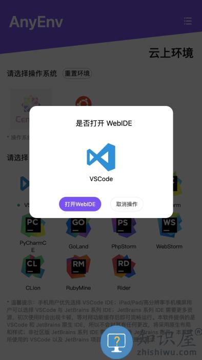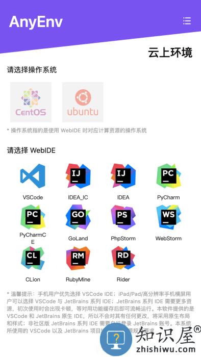 项目目前支持centos和ubuntu两种运行环境,开发者可以在环境创建完成之后,通过开源webide(目前anyenv项目提供部分jetbrains webide以及vscode webide),进行运行环境的链接,并快速的进行云上代码开发。