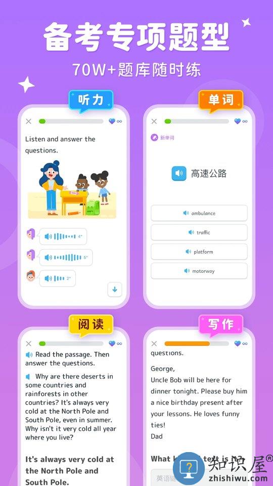 2.通过丰富题型,兼顾锻炼听、说、读、写四大能力