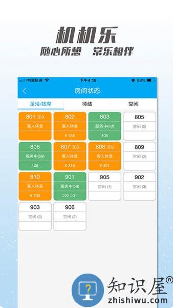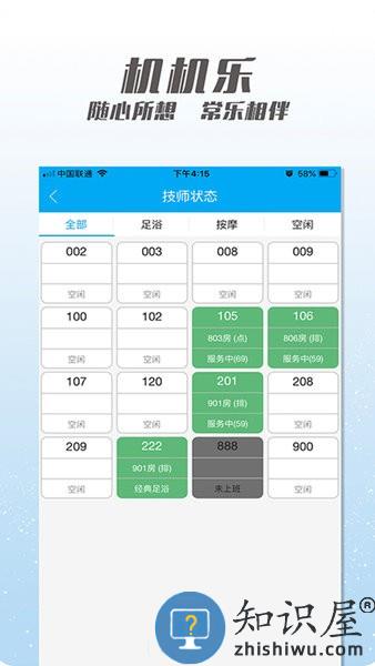 机机乐5g楼面端内置数据报表平台,还有一键门店考勤,可以在上面快速的查询自己的项目业绩,一键进行沐足管理功能,查看客房的运营状态,查看技师是否空闲!