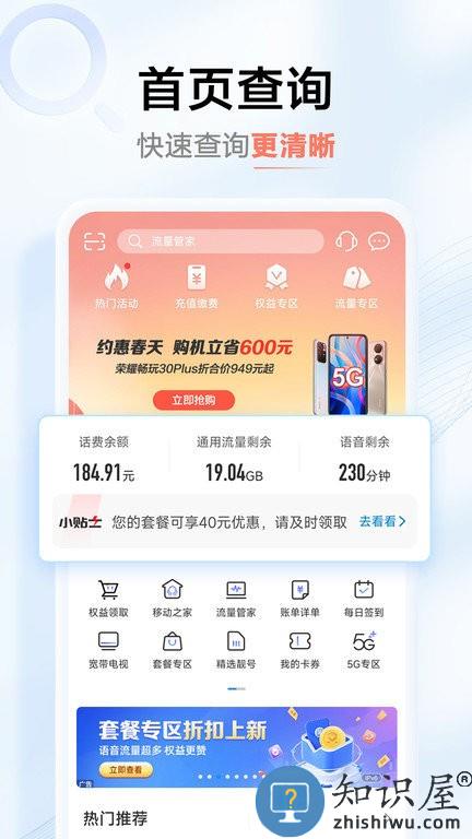 消费查询 随时随地:支持流量、话费、账单、套餐、已开业务查询;