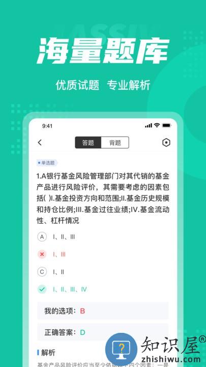 基金从业资格考试聚题库app是教育学习类的软件,为大家提供了海量的题库资源,可以随时随地进行刷题,每道题都有非常专业的解析,涵盖了大量的知识点,帮助用户掌握更多的解题思路,有需要的用户快来下载使用吧。