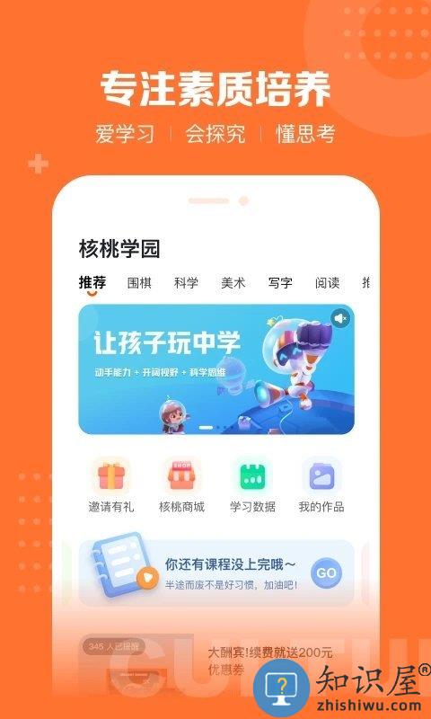 核桃学园是为7-12岁的孩子提供练字,绘画,口才,动手能力等素养学习内容的平台,专业的教研团队结合海量的学习数据支持,帮助孩子全方位发展。采用学+玩相结合的模式,让学习充满趣味性与互动性,锻炼孩子的创意思维、审美能力、专业技能。核桃学园,专注儿童全方位发展!
