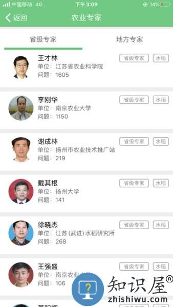 答:点击首页的搜索条,输入想要搜索的关键词(如“水稻”)后点击搜索,会跳出搜索结果页面,并已按照资讯、交流、问答、专家、视频进行了分类,用户可点击查看详情。