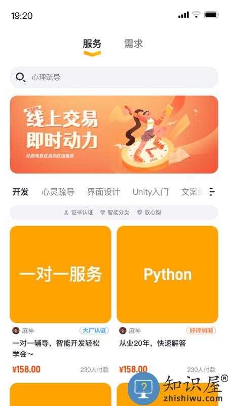 软商品服务数字平台,在线交易,快速找到自己需要的知识、技能,轻松共享,满足个人需求。用户能够出售个人技能、经验、知识,轻松实现技能变现。