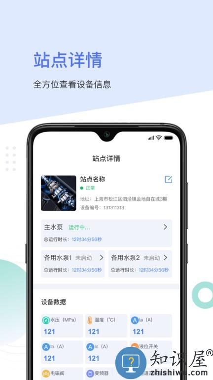 聚倍智慧水泵app可以查看每个水泵站点的详细信息,可以看到用电量、站点的异常数量等数据,站点的水压电流温度等参数显示的非常详细,可以直接在手机上添加新的站点,还能控制开关。