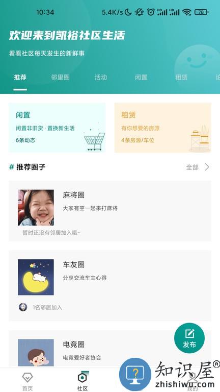 发布社区圈子,和邻居聊天、发布二手闲置、车位房屋租赁信息等。