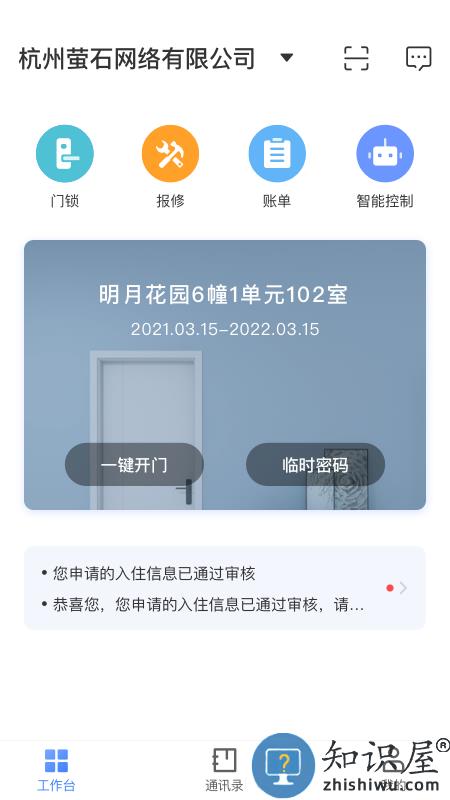 萤石易智居app最新版能够用手机一键开门,可以智能绑定和控制家居,家居家电出现异常还能在线报修,可查看账单并在线缴费,房屋的管理人员可以查看每个房间的入住状态以及居住人数。