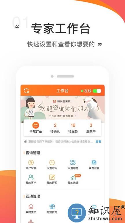 情说专家版app最新版专为专家用户打造,能够在手机上查看最新的客户咨询和倾诉,及时为客户排忧解难,可以自由设置自己的收费标准,支持查看客户的评价,还能进行互动,查看详细的订单数据统计。