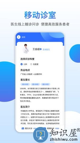 移动诊室:医生突破时间空间限制,可实现各种在线出诊业务,包括问诊、复诊、续方、开检查、开处方等各种服务。