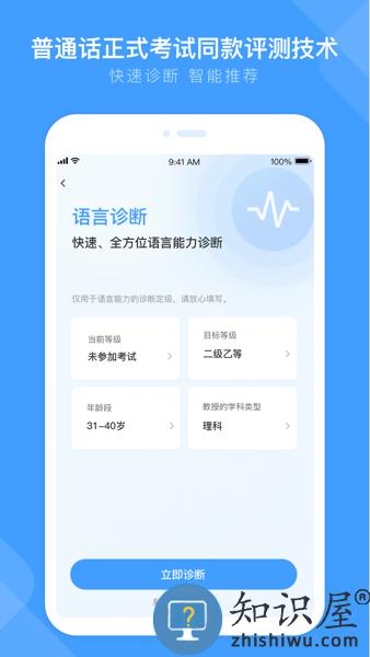 参照《国家普通话水平测试大纲》,题型覆盖单音节字词、多音节词语、朗读短文和命题说话。诊断结束后,系统会生成水平测试报告,用户通过查看报告了解自身的普通话水平等级及存在语音问题。
