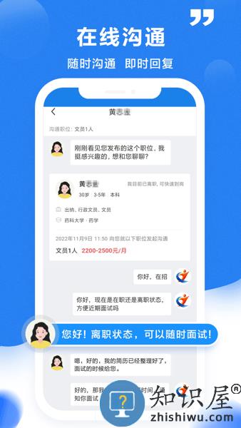 最后,还提供了在线沟通的功能,让求职者和招聘企业可以随时沟通,并实时回复,为求职者和招聘企业之间搭建了一座畅通的沟通桥梁。