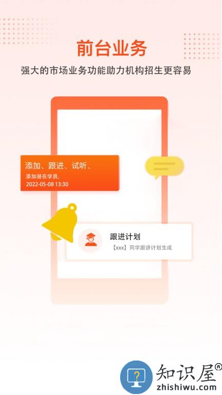 培训机构的教师用来管理咨询学员、跟进、试听、查看学员剩余课时有多少,学员请假审批,老师查看课表、看课上课记录,上课点名、课消记录、家校服务、给学员报名、管理订单、报销管理、查看各种财务数据、查看待办事项提醒、接收各种消息和查看我的工资、我带的学员等功能。