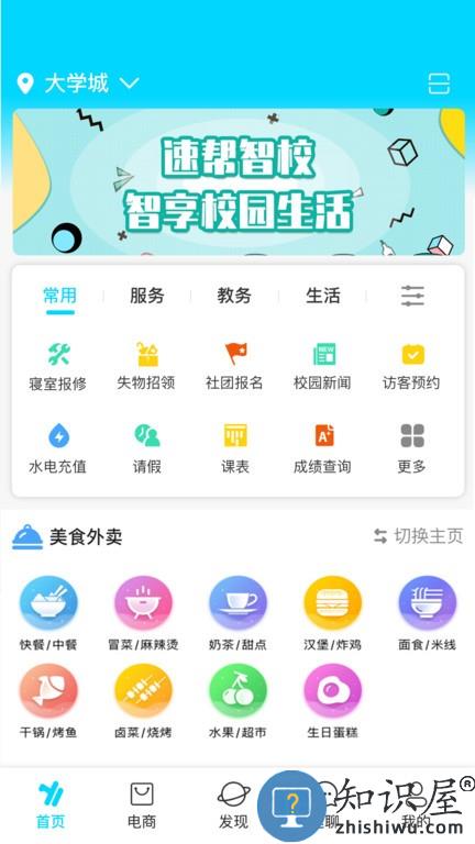 速帮云校APP是一款服务于高校在校学生的综合性生活服务平台,提供校园外卖、寝室报修、失物招领、访客预约、校园二手、水电充值、校园新闻、成绩查询、社团报名、电子课表、设备借还、校车预订等服务。