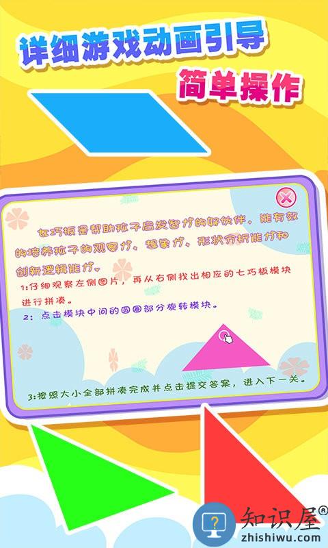 简易的实际操作游戏玩法,只需拖动显示屏上边的七巧板挪动到恰当的部位哦