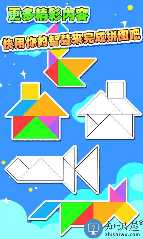 还记得曾经玩过的七巧板吗?又或许你还不曾玩过。没有关系,现在你可以通过手机,轻松拥有经典游戏了。七巧板是一种极具历史内涵,老少皆宜,被无数人喜欢的益智拼图类游戏。七巧板还是幼教游戏,玩法非常简单而且显而易见,是开发幼儿智力和颜色认知的游戏。游戏玩法:给出一个物体的外形,然后用七个固定的简单图形通过旋转角度、移动位置等操作来拼接出这个物体。拼接完成后点击提交答案,就可以判断是否正确了,如果拼接正确,会进入下一个关卡。如果游戏遇到困难,还可以点击偷看一下查看答案哦。聪明的宝宝们,快来挑战你的聪明才智吧。
