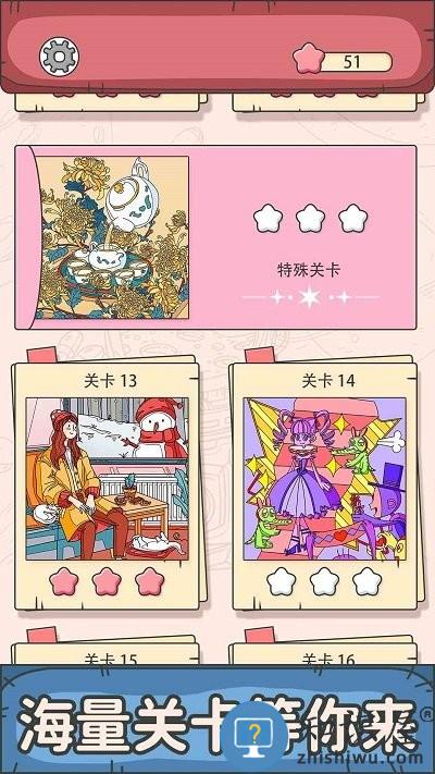 4、用简易的几类就能拼成各种各样的图案设计,只需将格子放到恰当的部位就可以通关;
