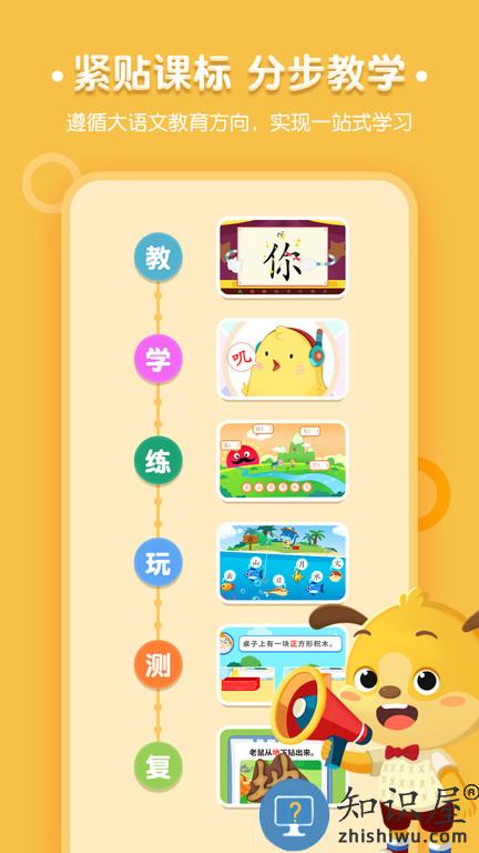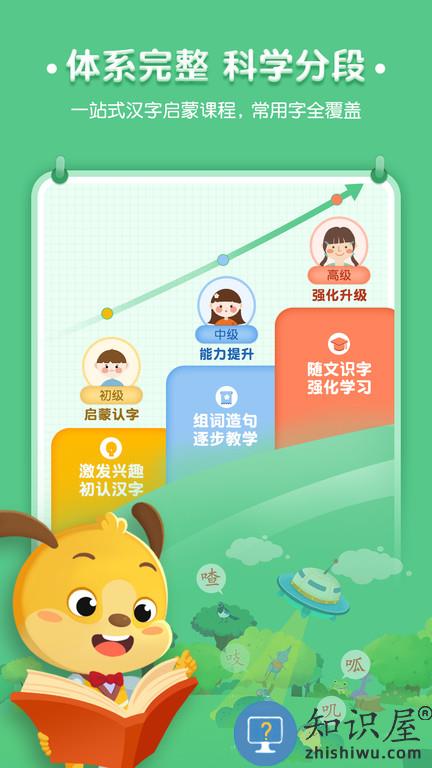 1、进阶式课程设计:故事导入、汉字变化、汉字游戏、词语游戏、句子游戏五个模块;