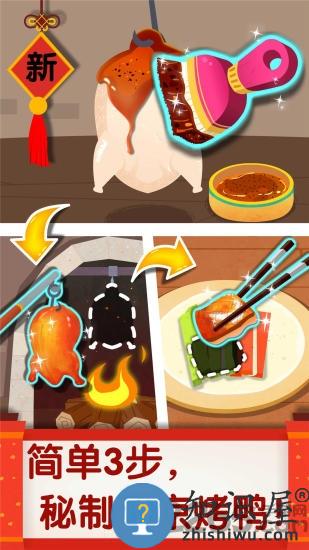 宝宝把烤鸭挂在壁炉,烤至表皮金灿,肉质焦嫩,取下切成片,焦酥烤鸭做好啦!搭配葱丝、黄瓜条,卷在薄饼里,蘸上甜辣酱,地道片鸭出炉。