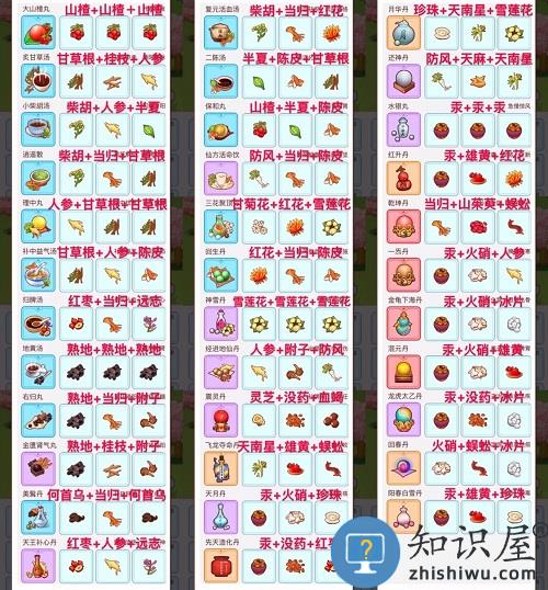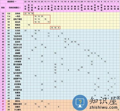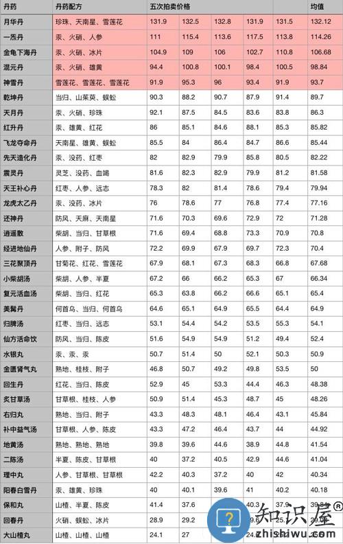 -月华丹 + 一炁丹(金龟下海丹/混元丹) + 乾坤丹 这种组合,所需药材不重复,又能炼出90↑高价 -理中丸/阳春白雪丹/回春丹/大山楂丸 不推荐炼丹 有材料就合成别的丹药 或者拆开单卖(新版图谱中 人参珍珠灵芝最贵) -药材只有唯一丹方:山茱萸-乾坤丹 灵芝/血竭-震灵丹 天麻-还神丹 甘菊花-三花聚顶丹 何首乌-美髯丹 -蝉蜕/蒲公英/艾叶/薄荷叶/枇杷叶/银杏叶,挖到会消失转化成声望 -石斛/海马/板蓝根/冬虫夏草 不能炼丹 单卖价格非常高,嫌多也可合成头脑保健丸(30金叶子) 1、新版丹药图鉴:
