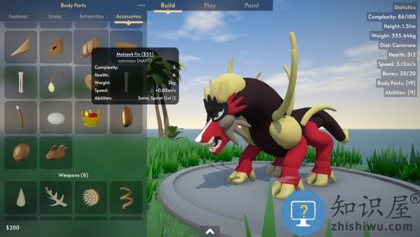 -在建造模式中,您可以通过操纵其脊椎来自定义生物的形状,并附加可变换身体部位。更改您的生物会更改其统计数据(例如重量,速度,健康等),并附加某些身体部位会使其具有特殊能力(例如飞行,游泳,咬等)。