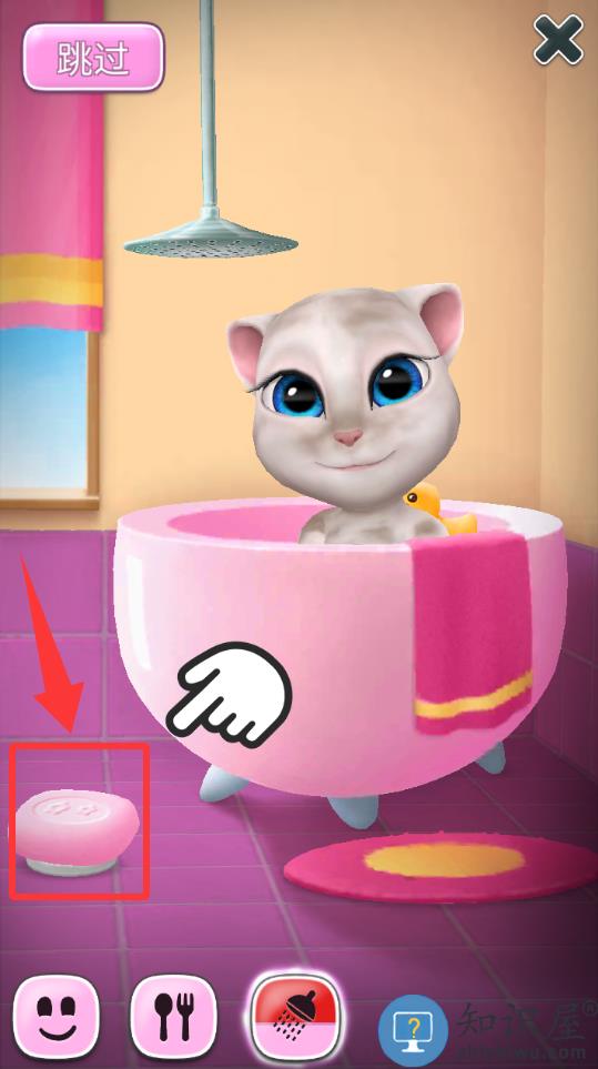 2、点击红色框框里的肥皂给小猫泡澡用。