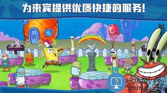 以经典动画海绵宝宝为主题设计的餐厅经营类游戏,尊重了动画元素的设计,以原创的角色形象带给玩家一种轻松互动模式的休闲经营乐趣,欢乐十足,神奇的蟹堡王和珊迪的家里,或者海绵宝宝家门口经营餐厅,不断的开发出新品种的食物,满足顾客们额需求才能赚很多钱。